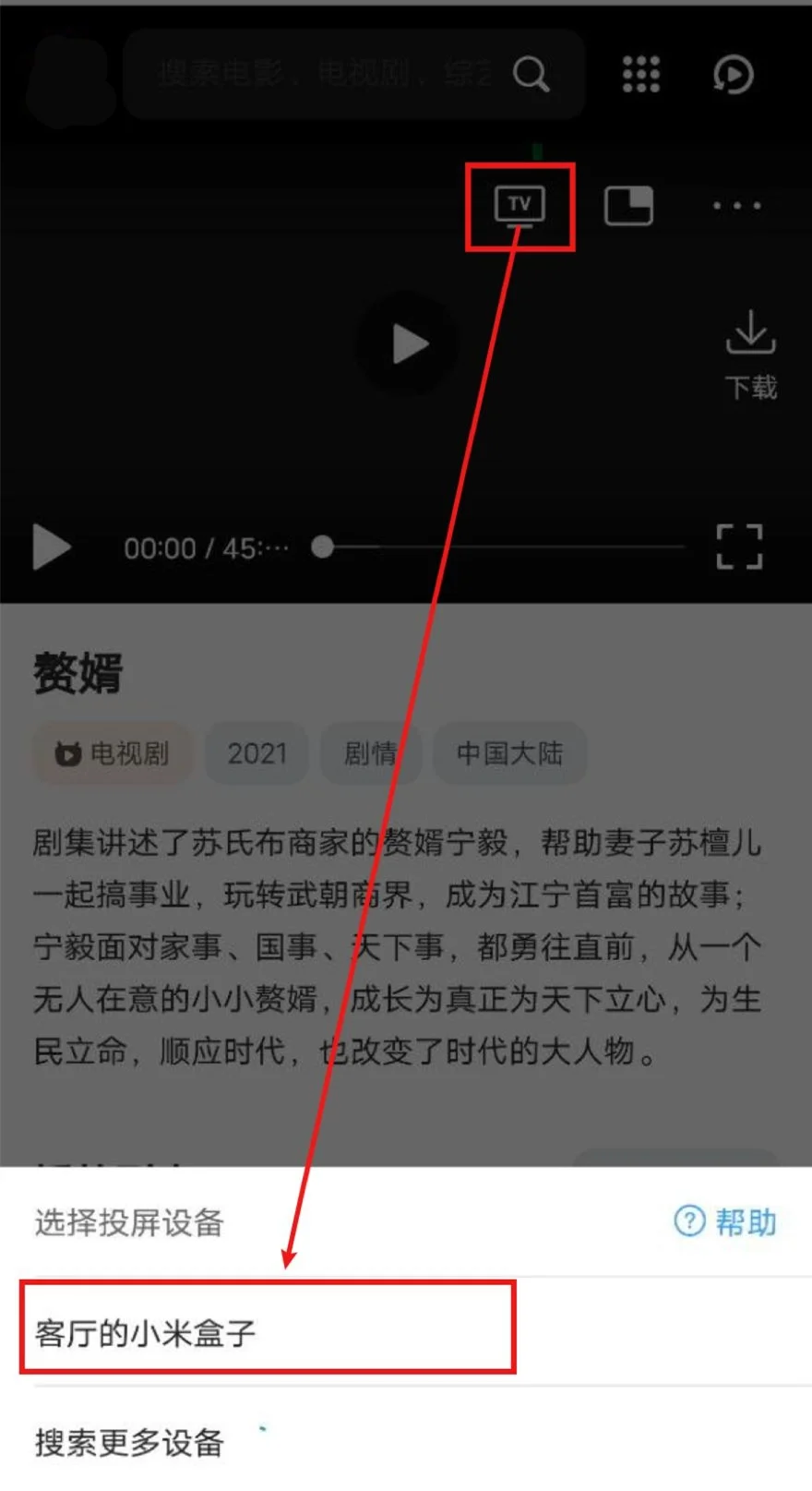打开QQ浏览器(会接管网页播放器)->打开星河影院->播放视频->选中投屏图标->等待搜寻出智能电视/电视盒子->选中,即可投屏。